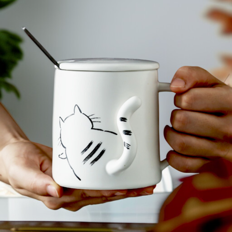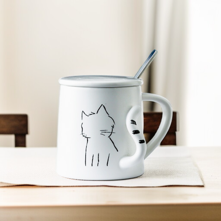 Handmade Ceramic Cat Character Coffee Mug with Lid